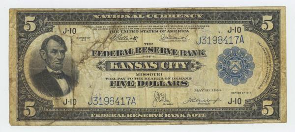 1918 FIVE DOLLAR NATIONAL CURRENCY KANSAS CITY