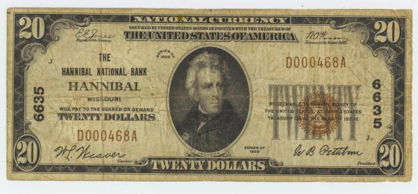 1929 TWENTY DOLLAR NATIONAL CURRENCY HANNIBAL MO