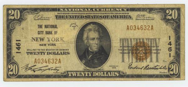 1929 TWENTY DOLLAR NATIONAL CURRENCY NEW YORK