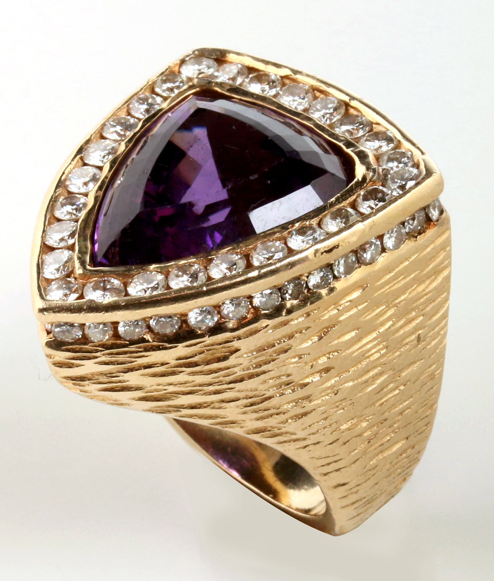 A big heavy mounting textured with rustic finish and set with a trillion cut amethyst approximately 11 carats in size measuring 20 x 16 millimeters and set in 14k gold with a frame of twenty-six .10 carat channel set diamonds around the center stone; thirty-nine .03ct channel set diamonds encircling the outside of the shank. The total weight of diamonds is estimated at 3.77 carats total weight. Ring size 9 with a weight of 69 grams.