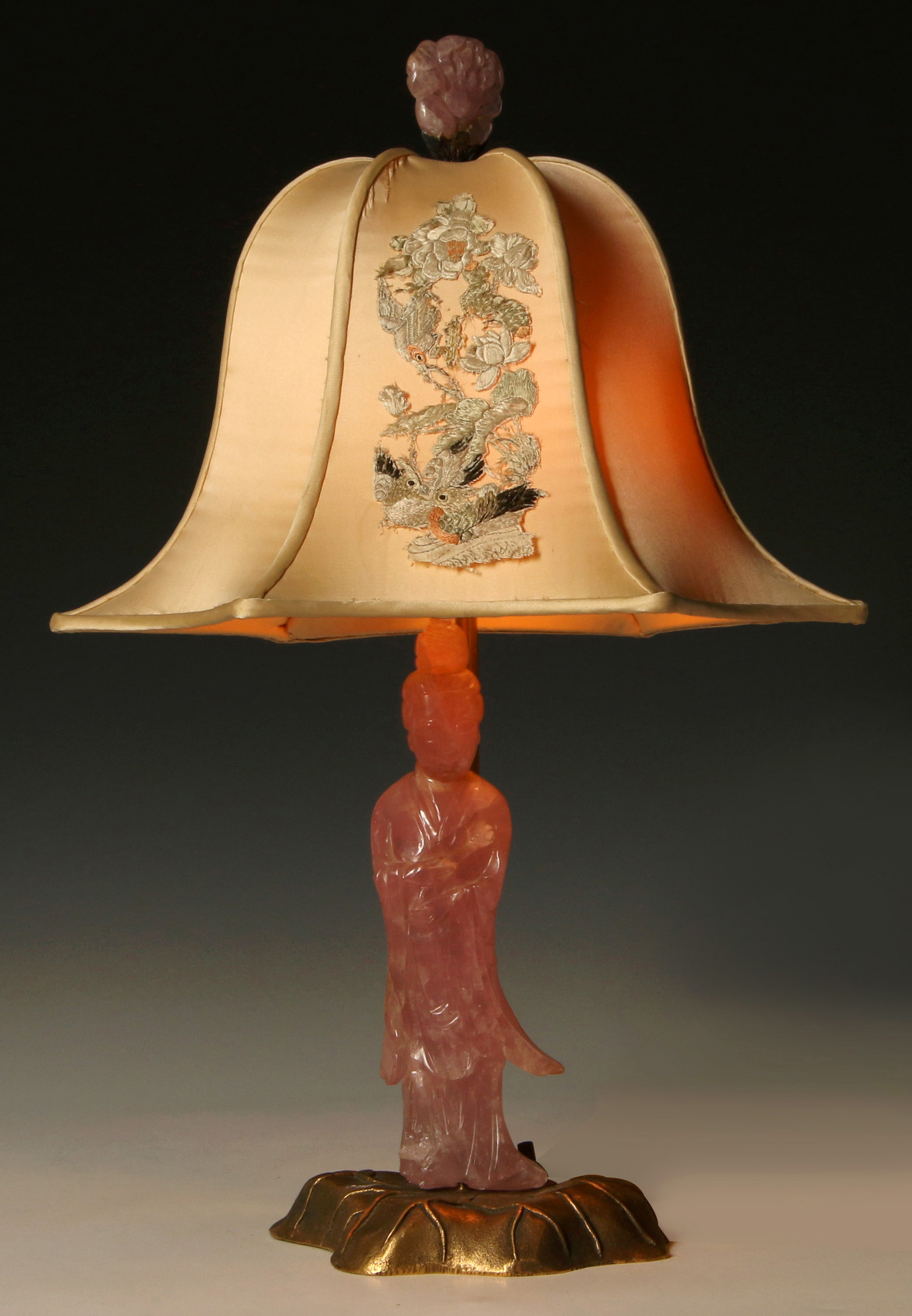A Chinese carved rose quartz figure on ormolu base fitted with an original period embroidered shade. Measures 16.5 x 11.5 inches.