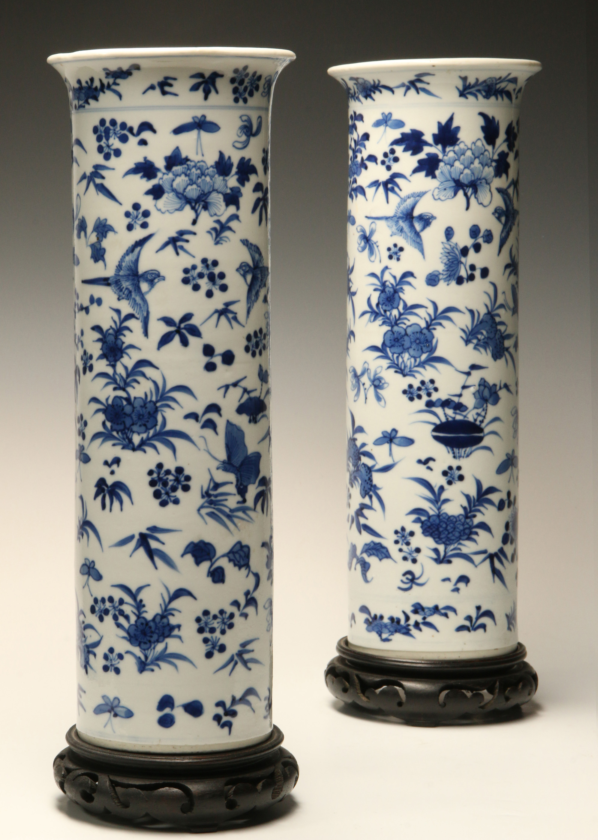 A pair of Chinese cylindrical porcelain vases with underglaze blue birds, flowers, and butterflies designs, on carved hardwood stands; apocryphal base mark of Kangxi reign. Pair measures 13.25 x 4.5 inches.