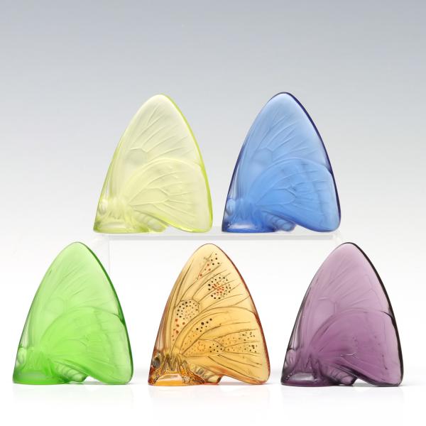FIVE COLORED ART GLASS BUTTERFLIES SIGNED LALIQUE