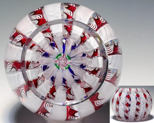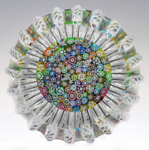 PERTHSHIRE LATTICINO RIB MILLEFIORI PAPERWEIGHT IN BOX