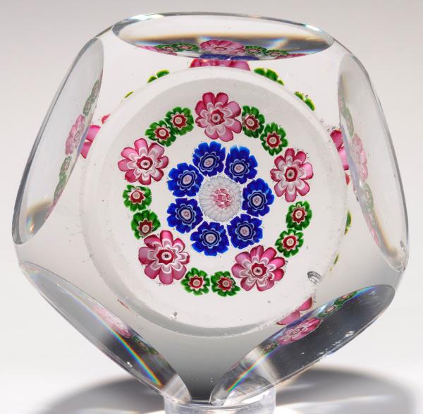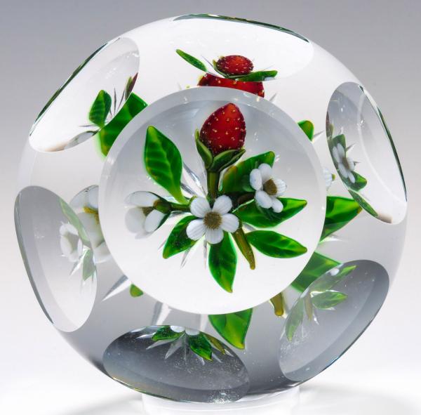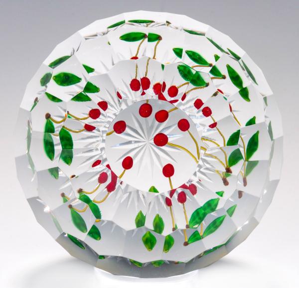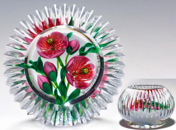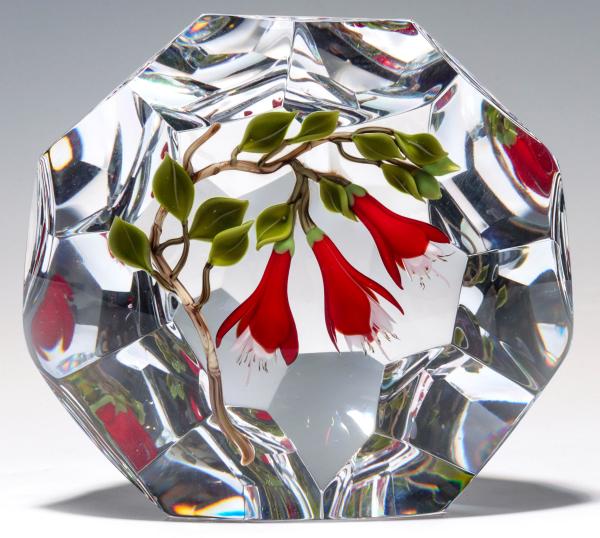 A KEN ROSENFELD FACETED PAPERWEIGHT WITH FLORAL SPRAY