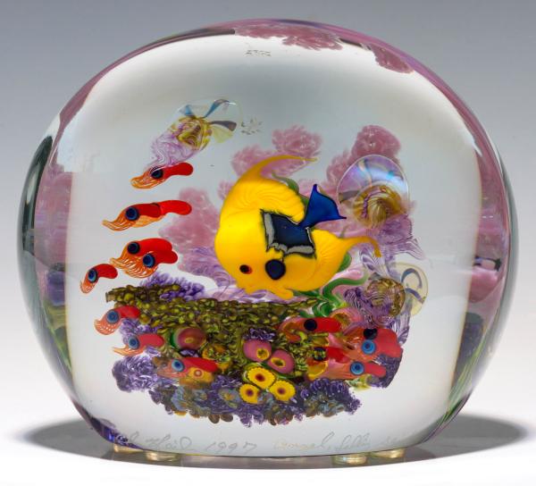 OCEAN WAVE PAPERWEIGHT W/ AQUATIC LIFE SIGNED ZELLIQUE